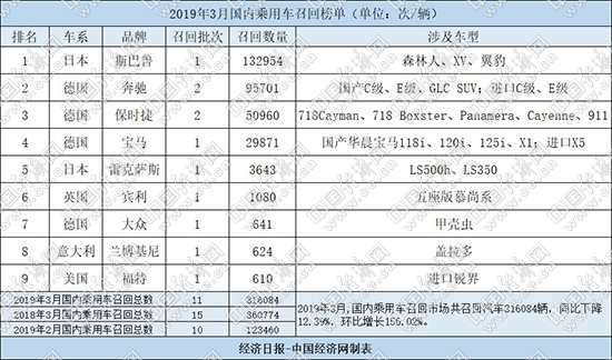 根據(jù)國(guó)家市場(chǎng)監(jiān)督管理總局缺陷產(chǎn)品管理中心3月份發(fā)布的召回公告,經(jīng)濟(jì)日?qǐng)?bào)-中國(guó)經(jīng)濟(jì)網(wǎng)汽車頻道經(jīng)過匯總、統(tǒng)計(jì),整理出“2019年3月國(guó)內(nèi)乘用車召回榜單”。3月,國(guó)內(nèi)乘用車市場(chǎng)共有9個(gè)品牌累計(jì)發(fā)布9起召回公告,共計(jì)召回汽車316084輛,同比下降12.39%,環(huán)比增長(zhǎng)156.02%。