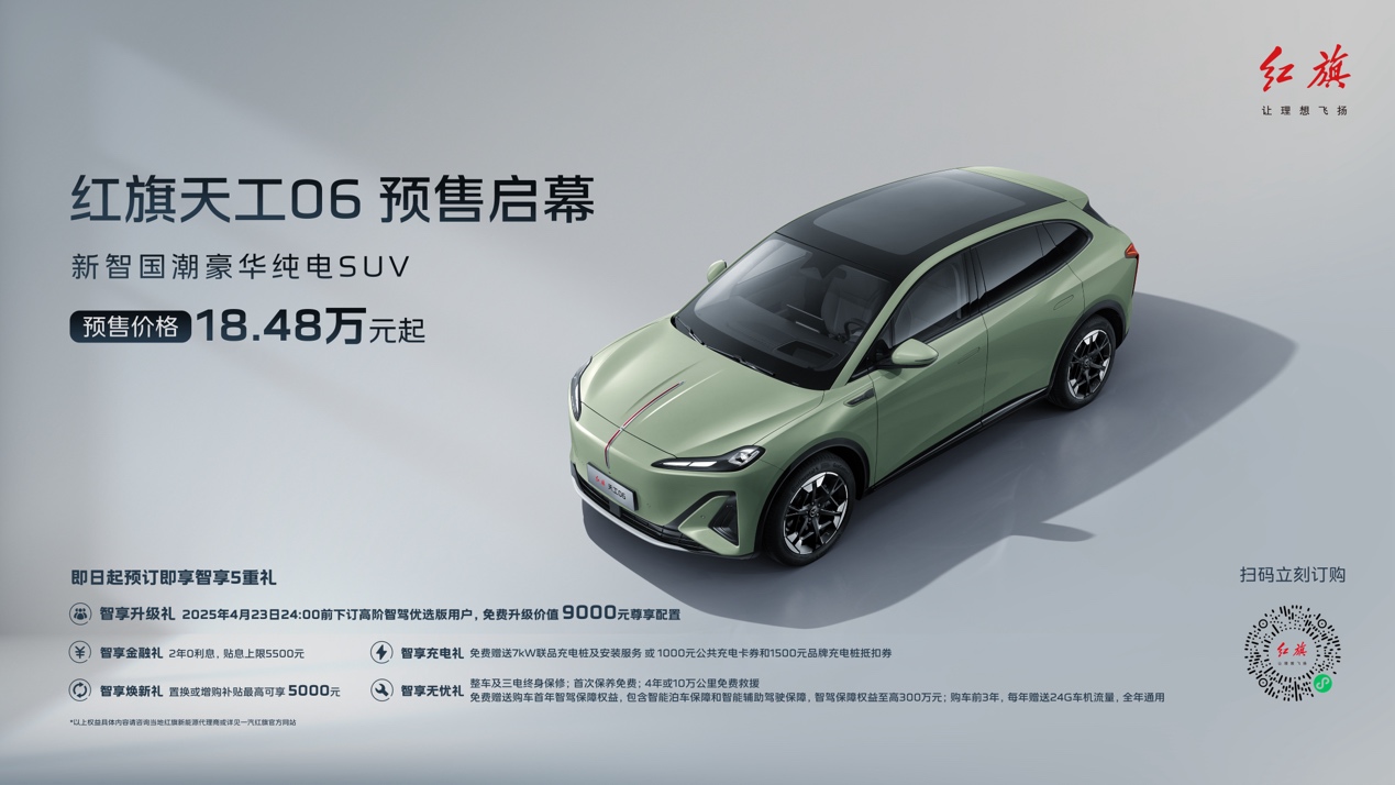 天工06定位新智國潮豪華純電SUV,除搭載了與天工05相同的司南智駕系統(tǒng)和靈犀座艙外,還配備了專屬超級適時智能四驅系統(tǒng),擁有毫秒級的四驅介入響應,既可為用戶提供卓越的四驅駕乘體驗,又能讓用戶享受兩驅的極低電耗。此次紅旗品牌智能體驗日天工06正式開啟預售,預售價格18.48萬元起,并帶來豐厚的“智享五重禮”預訂權益。