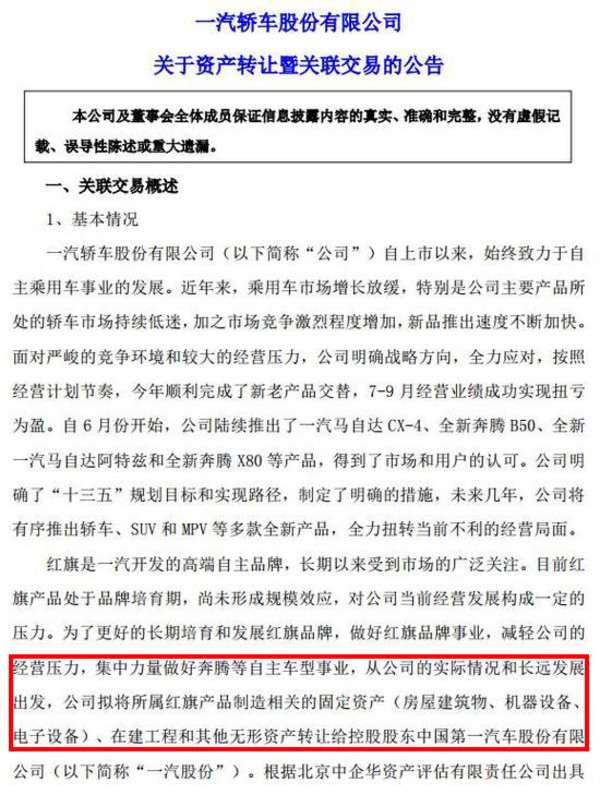 根據(jù)此前公告,一汽轎車根據(jù)資產(chǎn)評估的結果,在和一汽集團協(xié)商一致的前提下,將評估價值為3.7億元的紅旗旗下資產(chǎn),以含增值稅人民幣 4.2億元的交易價格轉讓給一汽股份,并且表示, 本次資產(chǎn)轉讓的關聯(lián)交易已經(jīng)在第七屆董事會第七次會議中審議通過,在交易合同簽署生效后20天內一汽股份需要向一汽轎車支付轉讓資產(chǎn)價款。這意味著,紅旗品牌已歸屬于一汽股份所有,從一汽轎車中獨立出來。(圖/文 網(wǎng)通社 陳旭明)