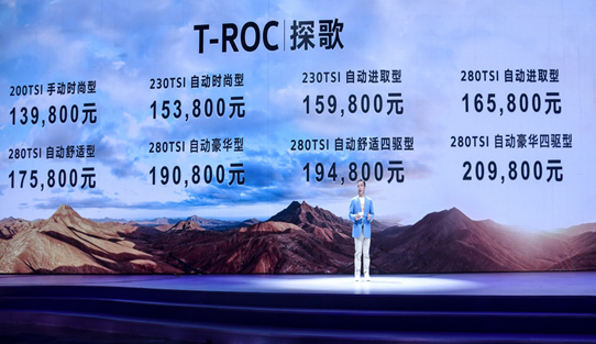 7月30日, 一汽-大眾首款SUV——T-ROC探歌在深圳上市。新車提供200TSI、230TSI和280TSI三款動(dòng)力選擇,并提供四驅(qū)版本,共8款車型,售價(jià)區(qū)間13.98-20.98萬(wàn)元。