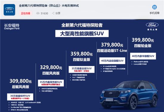 作為長(zhǎng)安福特“大型高端旗艦SUV”,全新第六代福特探險(xiǎn)者共推出5款車型,售價(jià)區(qū)間為30.98萬(wàn)-39.98萬(wàn)元,全系支持6座或7座布局選擇。