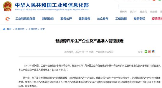 人民網(wǎng)北京8月20日電(王紫)19日,工信部正式發(fā)布了修改后的《新能源汽車生產(chǎn)企業(yè)及產(chǎn)品準入管理規(guī)定》(以下簡稱“規(guī)定”)?!兑?guī)定》刪除了包括第五條以及《新能源汽車生產(chǎn)企業(yè)準入審查要求》等附件中有關(guān)“設計開發(fā)能力”的相關(guān)內(nèi)容;將新能源汽車生產(chǎn)企業(yè)停止生產(chǎn)的時間由12個月調(diào)整為24個月;刪除了有關(guān)新能源汽車生產(chǎn)企業(yè)申請準入的過渡期臨時條款。《規(guī)定》將自2020年9月1日起施行。