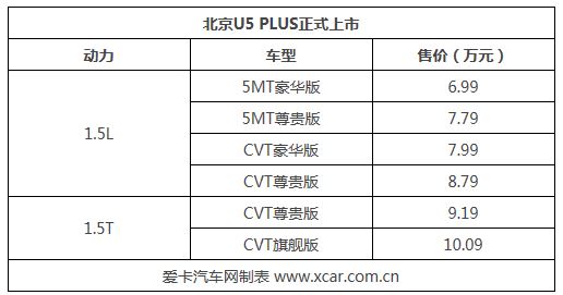 9月23日,北京U5 PLUS正式上市,售價(jià)區(qū)間為6.99-10.09萬元。北京U5 PLUS是北京U5的中期改款車型,新車在名字后面加了一個(gè)PLUS后綴。北京U5 PLUS配備了最新的北京汽車LOGO,外觀設(shè)計(jì)更加年輕化、內(nèi)飾科技感更足。詳細(xì)售價(jià)請(qǐng)見下表: