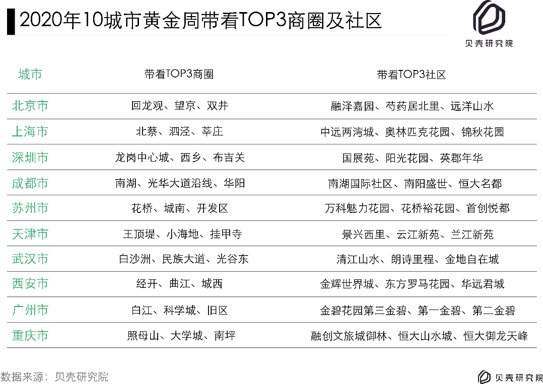 同樣,每個(gè)城市都有熱門商圈與人氣社區(qū)。此次,貝殼研究院特別梳理出2020年黃金周期間帶看量最高的十個(gè)城市,并找到其熱門商圈和社區(qū)。以城市帶看龍頭北京為例,回龍觀、望京、雙井商圈帶看熱度高,排名城市商圈TOP3;而融澤嘉園、芍藥居北里、遠(yuǎn)洋山水三個(gè)社區(qū)帶看熱度在社區(qū)榜中關(guān)注度最高。