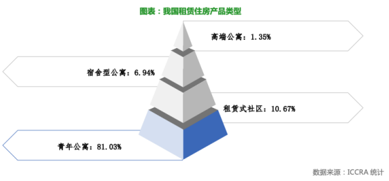 報(bào)告指出,我國(guó)租賃住房類型整體呈現(xiàn)出明顯的“正金字塔”形態(tài):滿足年輕人需求的青年公寓占比最大,超過(guò)80%;其次是滿足新市民需求的租賃式社區(qū),占比超過(guò)10%;面對(duì)企業(yè)基層員工的宿舍型公寓占比8.62%;服務(wù)式公寓比例僅為1.35%。