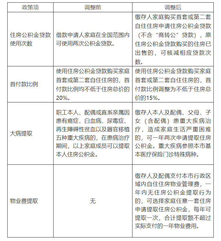 其中提出,優(yōu)化住房公積金貸款使用次數(shù)認定標準。繳存人家庭購買首套或第二套自住住房申請住房公積金貸款(不含“商轉(zhuǎn)公”貸款),原住房公積金貸款購買的住房已出售的,可核減相應(yīng)貸款次數(shù)。 繳存人家庭核減貸款次數(shù),須提供有房(無房)證明,原住房公積金貸款為本中心以外的單位發(fā)放的,另須提供原借款合同。 同時,下調(diào)住房公積金貸款首付款比例。使用住房公積金貸款購買家庭首套或第二套自住住房的,首付款比例調(diào)整為不低于住房總價的15%。 另外,擴大患重病提取住房公積金范圍。繳存人本人及配偶、父母、子女(含配偶)患重大疾病治療,造成家庭生活嚴重困難的,可一年兩次申請?zhí)崛∽》抗e金,提取額度不超過醫(yī)保核定的個人自付和個人自費之和。重大疾病參照本市基本醫(yī)療保險門診特殊病種。 此外,支持物業(yè)費提取住房公積金。繳存人本人及配偶支付蘇州市行政區(qū)域內(nèi)自住住房物業(yè)管理費,可選擇家庭任意一套住房申請?zhí)崛∽》抗e金,申請前十二個月應(yīng)無住房公積金提取行為,一年可提取一次,合計提取額不超過實際支付的一年物業(yè)費用。個人住房公積金賬戶須至少按最新繳存基數(shù)留存一個月的繳存額(不含新職工補貼)。 支付物業(yè)費申請?zhí)崛∽》抗e金的,須提供身份證件、婚姻關(guān)系證明或單身聲明(現(xiàn)場簽署)、房屋不動產(chǎn)權(quán)證書(或房屋所有權(quán)證)、物業(yè)費發(fā)票(一年內(nèi)有效),與繳存人住房公積金個人賬戶關(guān)聯(lián)的銀行卡。 新舊政策對比如下: