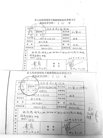 土地檔案中《國(guó)有土地使用權(quán)出讓審批卡片》與劉聚川提供的原件復(fù)印件對(duì)比。記者 朱旭東 攝