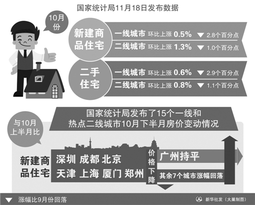 國家統(tǒng)計局城市司高級統(tǒng)計師劉建偉介紹,與10月份上半月比,10月份下半月新建商品住宅價格除深圳和成都2個城市繼續(xù)下降外,北京、天津、上海、廈門和鄭州等5個城市也由升轉(zhuǎn)降,降幅在0.1至0.4個百分點(diǎn)之間;其余7個城市新建商品住宅價格環(huán)比漲幅進(jìn)一步回落,回落幅度在0.4至3.3個百分點(diǎn)之間。
