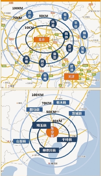 京津冀、東京都市圈輻射范圍對比
