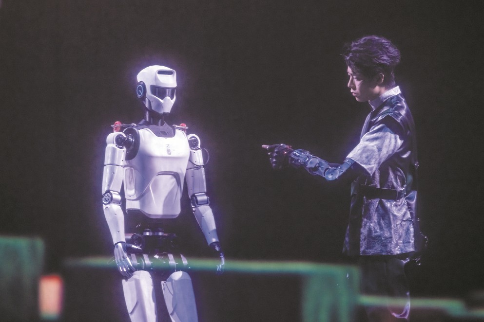 這是發(fā)生在中國大戲院長三角城市戲劇節(jié)中的最“科幻”一幕,國內(nèi)領(lǐng)先的機(jī)器人走出實(shí)驗(yàn)室和展廳,以接地氣、親和的方式來到普通人身邊。面對(duì)這樣的場(chǎng)景,人們不再那么陌生——2025春晚上,張藝謀導(dǎo)演的《秧BOT》讓人形機(jī)器人略顯滑稽地扭起秧歌;上半年,半程馬拉松也迎來人形機(jī)器人“跌跌撞撞”的身影?!拔覀?cè)谔剿饕环N可能性,試著模擬發(fā)生在未來的場(chǎng)景?!薄毒尬镏恰匪囆g(shù)總監(jiān)、上海戲劇學(xué)院藝術(shù)科技與管理學(xué)院副院長沈倩對(duì)記者說,“無論對(duì)于機(jī)器人還是演藝產(chǎn)業(yè)來說,都具有破圈的意義?!闭\然,機(jī)器人仍在亦步亦趨地努力跟上人類的節(jié)奏,但其不斷前進(jìn)的腳步已經(jīng)令人激動(dòng)。面對(duì)“人機(jī)共生”的時(shí)代命題,上海邁出了全國舞臺(tái)實(shí)踐的第一步。