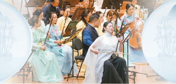 演出由知名華人指揮家湯沐海執(zhí)棒,來自上海民族樂團的70余位演奏家一同奏響華章?!昂I仙駱贰狈忠魳窌婧蜕虾R魳窂d駐場版,前者偏向西方當代交響音樂會的制式,后者則融入多媒體光影,更傾向于沉浸式音樂現(xiàn)場。因而,曲目會根據(jù)現(xiàn)場環(huán)境和觀眾特征做適當調整。國外演出時,會增加二胡與樂隊合奏的《臥虎藏龍》(見上圖)——這是東西方觀眾都熟悉,甚至會在眼前浮現(xiàn)出竹林搖曳畫面的曲目。音樂會版在編曲上的處理會在尾聲處以漸強手法處理中西樂器的合奏共鳴,把情感推向高潮。琵琶、京胡與樂隊合奏的《楚漢》中,俞冰的琵琶獨奏氣勢不凡,凸顯出西楚霸王的威武。嗩吶與樂隊合奏《鳳舞》時,胡晨韻不僅能吹出一個超乎常人想象的長音,還能與笛子手等一起營造一群鳥兒的生動“對話”,時而平和時而激動,惹得觀眾忍俊不禁。而改編自膾炙人口的《野蜂飛舞》的民樂重奏《蜂飛》則賦予俄羅斯作曲家里姆斯基-科薩科夫的經(jīng)典名曲“中華風韻”——眼見著民族樂器在王音睿、趙臻、丁龍等掌控的打擊樂、笙和二胡的樂音中展現(xiàn)出妙趣橫生的“畫面”。而開場,金鍇與趙韻夢領銜的竹笛與樂隊合奏《湖光》則凸顯出江南文化的音樂聲色。