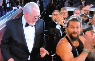 “海王”的扮演者杰森·莫瑪作為頒獎(jiǎng)嘉賓今年首次亮相金球獎(jiǎng)。此前,網(wǎng)絡(luò)上曝光了杰森為金球獎(jiǎng)“精心打扮”的視頻,視頻中杰森身著藍(lán)綠色絨面禮服,由工作人員幫忙整理裝飾;杰森則興奮地甩動(dòng)自己長(zhǎng)而卷的頭發(fā)。然而頒獎(jiǎng)典禮上,當(dāng)鏡頭拍到臺(tái)下落座的杰森時(shí),他不僅將頭發(fā)扎了起來,西服也不見蹤影,身上只穿著一件黑色背心,露出結(jié)實(shí)的肌肉。該一晃而過的鏡頭也成為今年金球獎(jiǎng)最有趣的畫面之一。
