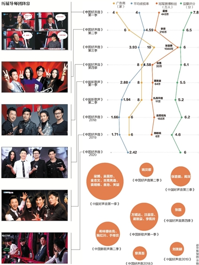 2013年,《中國好聲音》第二季再創(chuàng)收視高峰,但相較第一季,口碑評分下降明顯,其中關(guān)于真人秀痕跡過重,選手過度“賣慘”的質(zhì)疑,遠(yuǎn)大于對音樂的探討。而第二季的冠軍李琦,直到五年后,他參與了某衛(wèi)視美聲競演節(jié)目后才再次被大眾關(guān)注。第三季亞軍帕爾哈提、季軍余楓,第四季冠軍張磊、亞軍陳梓童、季軍譚軒轅……這些曾經(jīng)站上鳥巢巔峰的選手,至今能被觀眾叫上名字的屈指可數(shù);很多后來又成為其他選秀節(jié)目的“回鍋肉”。