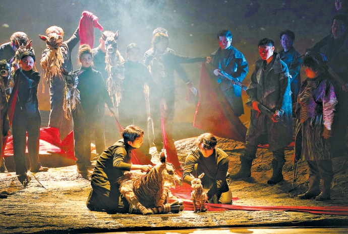 在舞臺呈現(xiàn)上,舞美設計常煒以“山的血脈”為核心意象,山體內(nèi)部的紋理宛若血液流動,山石土地俱在跳動、呼吸。整體來說,《可可西里》的舞臺置景變化并不劇烈,燈光、景片以及經(jīng)幡等裝飾以恰到好處的力度表明時間地點的轉(zhuǎn)換,暗喻劇情和人物內(nèi)心的走向——在有些舞臺作品選擇以噱頭和炫技招攬觀眾的當下,《可可西里》流淌著一種久違的、質(zhì)樸的暖意,主創(chuàng)團隊為這部作品付出了足夠的誠意,比如,無論是電影《可可西里》,還是人們對這片凈土的既有認知,動物都在其中扮演重要的角色,但毫無疑問,要在舞臺上把動物塑造得真實且有藝術(shù)表現(xiàn)力,并不容易。主創(chuàng)團隊沒有偷工減料地繞過這個難題,而是以模仿動物習性的“偶”代替,當從“母羊”的腹中剖開一卷鮮紅的長綢,“小羊”跌跌撞撞地學著起身時,溫柔灑落的天光配合層層遞進的音樂,把現(xiàn)場氣氛推向一次動人的高潮。