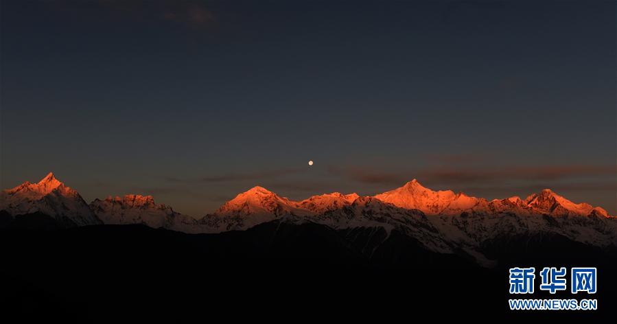 這是3月25日清晨拍攝的梅里雪山“日月同輝”景觀。梅里雪山位于滇藏交界的云南省迪慶藏族自治州德欽縣境內(nèi),是世界自然遺產(chǎn)“三江并流”的主要自然景觀之一。梅里雪山常年云霧籠罩,太陽(yáng)光只在少數(shù)天晴的清晨照射在雪山頂上,形成絕美的“日照金山”美景。有時(shí)月亮尚未落山,太陽(yáng)已經(jīng)升起,更是形成了難得一見(jiàn)的梅里雪山“日月同輝”奇觀。新華社記者 王長(zhǎng)山 攝 |