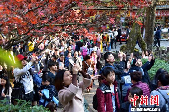 楓樹林下聚集大批游客拍照留念。 盧文偉 攝