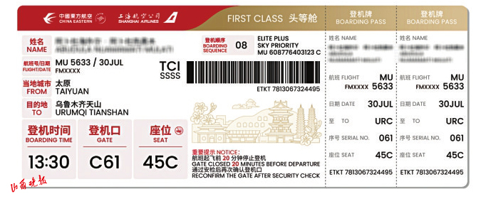 此次升級(jí)不僅注重文化表達(dá),更著力提升服務(wù)體驗(yàn)。登機(jī)牌對登機(jī)口、起飛時(shí)間、座位號(hào)等關(guān)鍵信息進(jìn)行了“放大提亮”處理,通過字體加粗、色彩對比等設(shè)計(jì),顯著提升了信息辨識(shí)度,特別方便老年旅客快速獲取信息,有效降低誤機(jī)風(fēng)險(xiǎn),體現(xiàn)了東航精細(xì)化服務(wù)理念。