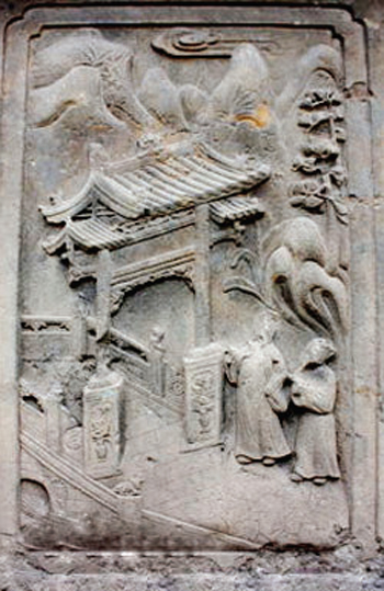 配坊實(shí)際上是一座功名石牌坊,上面刊載著武訪疇一家四代人的姓名及朝廷贈(zèng)封的官爵,咸豐六年(1856)由武訪疇修建。這座石雕牌坊與其它牌坊最大的區(qū)別就是沒有題刻坊名,因此只能稱之為配坊。坐北向南,為四柱三間三樓單檐歇山頂結(jié)構(gòu),牌樓高8米,寬12米,坊體坐落在近1米高的長方形臺(tái)基上,立柱仍然采用夾柱石固定。坊頂覆蓋青瓦,正脊飾石雕貔貅裝飾,飛檐翹角,明樓檐下為“圣旨”牌,當(dāng)心間設(shè)兩層小字板,第一層題刻:“贈(zèng)資政大夫曾祖父廷桂,贈(zèng)夫人曾祖母李氏;誥贈(zèng)資政大夫祖父秉壁,誥贈(zèng)夫人祖母吳氏;誥贈(zèng)資政大夫父烈,誥封夫人母朱氏。陜西分巡延榆綏兵備道、加四級(jí)武訪疇謹(jǐn)建?!钡诙宇}刻“大清咸豐六年歲次丙辰仲夏上院榖旦”。武訪疇借建坊要弘揚(yáng)祖輩陰德,而祖輩的姓氏大名又不能題刻在母親的節(jié)孝牌坊上,所以,他必須另建一坊才能完整地表達(dá)心愿。實(shí)際上,這就是建造配坊的真正目的。也正因此在配坊題刻“龍光錫寵”、“鳳詔褒榮”、“克成先志”、“重裕后昆”等。