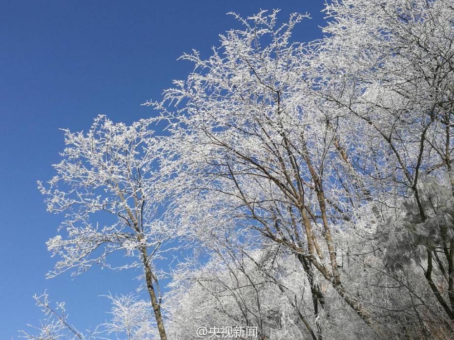 受較強(qiáng)冷空氣影響,秦嶺腹地涼風(fēng)埡山頂,出現(xiàn)大面積霧凇景觀。玉樹瓊枝,晶瑩剔透,讓涼風(fēng)埡山頂變得像童話世界一般,美不勝收。 央視記者王志杰 圖片來源:央視新聞微博