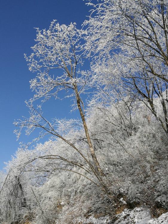 受較強冷空氣影響,秦嶺腹地涼風(fēng)埡山頂,出現(xiàn)大面積霧凇景觀。玉樹瓊枝,晶瑩剔透,讓涼風(fēng)埡山頂變得像童話世界一般,美不勝收。 央視記者王志杰 圖片來源:央視新聞微博