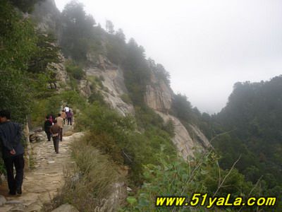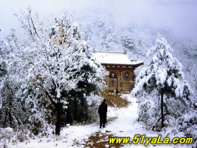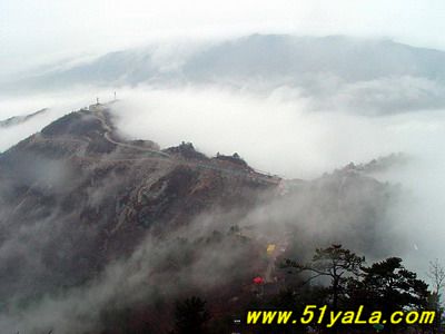 北武當山主峰四周幾乎都是陡壁懸崖,只有一條人造“天梯”可攀。來到山腳下,過五里黃土、五里沙路,便是1400余級就山鑿筑的石階,凡險峻之處,設有鐵索扶手。石階一線疊置,從下仰視,宛如“天梯”。游人攀登,每一步都可聽到悠揚頓挫的“石音”,形成獨特的“石樂”絕景。沿著石階,奇松異石、廟宇石刻,掩沒在蔥郁的山林植被之中,相間點綴,相映成趣。主要的山石景觀有:古猿望日、石豬受難、九龍出洞、石象守山、天壺傾露、石羊朝圣、石龜下蛋、石虎、石蛤蟆、龜蛇斗智等。最令人稱奇的是“龜蛇斗智”奇觀,相傳神龜和青蛇不安心修道,互相格斗,經過七七四十九天的麈戰(zhàn),神龜節(jié)節(jié)敗退,青蛇步步緊逼。其時,恰逢真武大帝返宮,見狀,輕輕用手指一點,龜蛇便動彈不得,從此永久停留在這里,成千古一絕——“蛇石”虎視眈眈,“龜石”尾臨懸崖,萬斤重石,峭立崖畔,用力一推或經風一吹,便搖搖欲墜,令人心懸,所以又稱風動石,為我國罕見的景觀之一。主要的奇松景觀有:鴛鴦松、迎客松、托天松、母子松等。最使人嘆為觀止的是“擎天探海松”,其松立于石階半道,樹身技分兩杈,一直刺青天,一枝瞰群峰。近金頂登南天門石階,旁邊陡崖上刻有“喬松”二字,據載為清代道光年間永寧州牧王繼賢手跡?,F存喬松樹樁直徑近1米,可以想見其昔日雄姿。主要的懸崖峭壁有:千仞壁、舍身崖、鷹嘴崖等。還有呈垂直分布的植被,其色彩和花期隨季節(jié)變化,給北武當山披上了“春粉、夏艷、秋紅、冬白”的盛裝。登臨武當之巔,一覽眾山,但見遠山蒼茫,近日含黛,松風撲面,白云飄逸;只聞松濤陣陣,山泉潺潺,鳥語唧唧,似琴弦輕撥;夏秋之季,如晴空萬里,金頂之下,叢林景觀相間,似七彩織錦;白云遠處,群山連綿,猶如萬龍翻騰,極為壯觀。