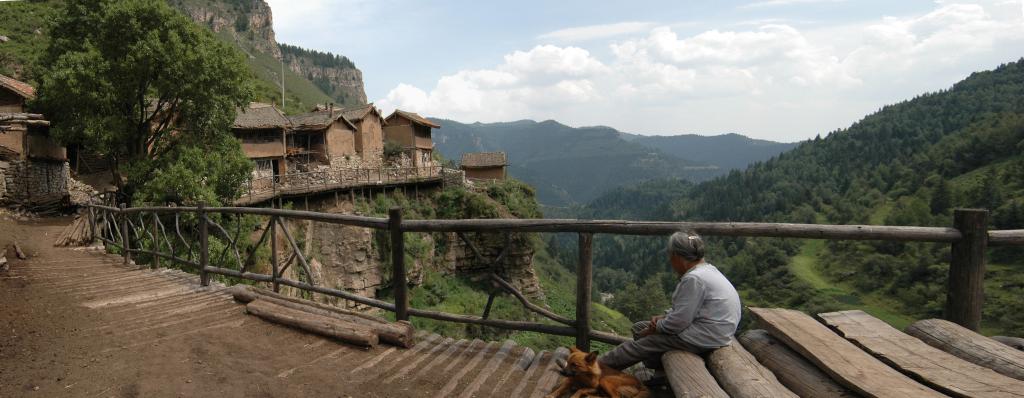 隱沒在深山老林中的王化溝分布在大約一華里長的絕壁上,背依懸崖,面臨百丈深淵。全村20余戶,60多口人。村西的懸崖上聳立著一塊巨石,村里人稱之為“石人”,村后的山也因此稱作“石人山”。村中的房子大都臨崖而建,以木柱支撐,高低錯落,避風(fēng)向陽。這些房子建在懸崖上看似危險,實則非常堅固,至今還有清代的房子保存完好。由于地盤不足,所以沒了庭院,只有一條走廊。就是街道也只能用木料搭建,懸于空中。當(dāng)然作為農(nóng)家,牲畜的圈舍是免不了的,這里也需要精心擺布,精心建造,絕不至于讓牲畜落下深淵。