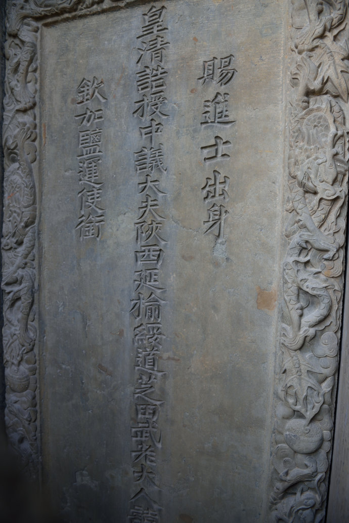 配坊實(shí)際上是一座功名石牌坊,上面刊載著武訪疇一家四代人的姓名及朝廷贈(zèng)封的官爵,咸豐六年(1856)由武訪疇修建。這座石雕牌坊與其它牌坊最大的區(qū)別就是沒有題刻坊名,因此只能稱之為配坊。坐北向南,為四柱三間三樓單檐歇山頂結(jié)構(gòu),牌樓高8米,寬12米,坊體坐落在近1米高的長方形臺(tái)基上,立柱仍然采用夾柱石固定。坊頂覆蓋青瓦,正脊飾石雕貔貅裝飾,飛檐翹角,明樓檐下為“圣旨”牌,當(dāng)心間設(shè)兩層小字板,第一層題刻:“贈(zèng)資政大夫曾祖父廷桂,贈(zèng)夫人曾祖母李氏;誥贈(zèng)資政大夫祖父秉壁,誥贈(zèng)夫人祖母吳氏;誥贈(zèng)資政大夫父烈,誥封夫人母朱氏。陜西分巡延榆綏兵備道、加四級武訪疇謹(jǐn)建?!钡诙宇}刻“大清咸豐六年歲次丙辰仲夏上院榖旦”。武訪疇借建坊要弘揚(yáng)祖輩陰德,而祖輩的姓氏大名又不能題刻在母親的節(jié)孝牌坊上,所以,他必須另建一坊才能完整地表達(dá)心愿。實(shí)際上,這就是建造配坊的真正目的。也正因此在配坊題刻“龍光錫寵”、“鳳詔褒榮”、“克成先志”、“重裕后昆”等。