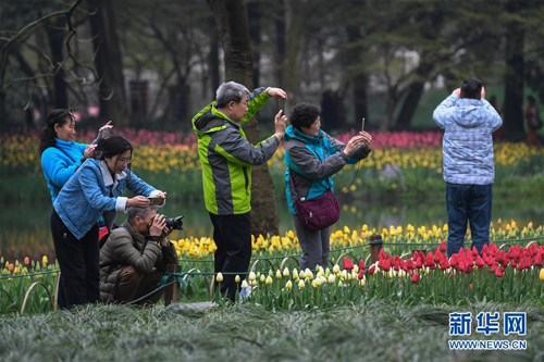 3月19日,市民和游客在太子灣公園觀賞盛開的郁金香。近日,浙江省杭州市西子湖畔太子灣公園里的郁金香、櫻花競相綻放,吸引大批游客和市民前來觀賞。 新華社記者 黃宗治 攝