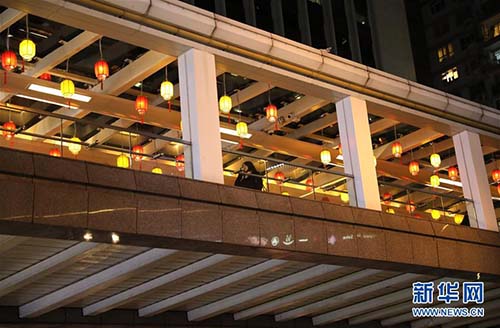 香港一過(guò)街天橋掛滿燈籠(1月23日攝)。 農(nóng)歷豬年臨近,香港街頭裝扮得流光溢彩,喜氣盈盈。 新華社記者 吳曉初 攝