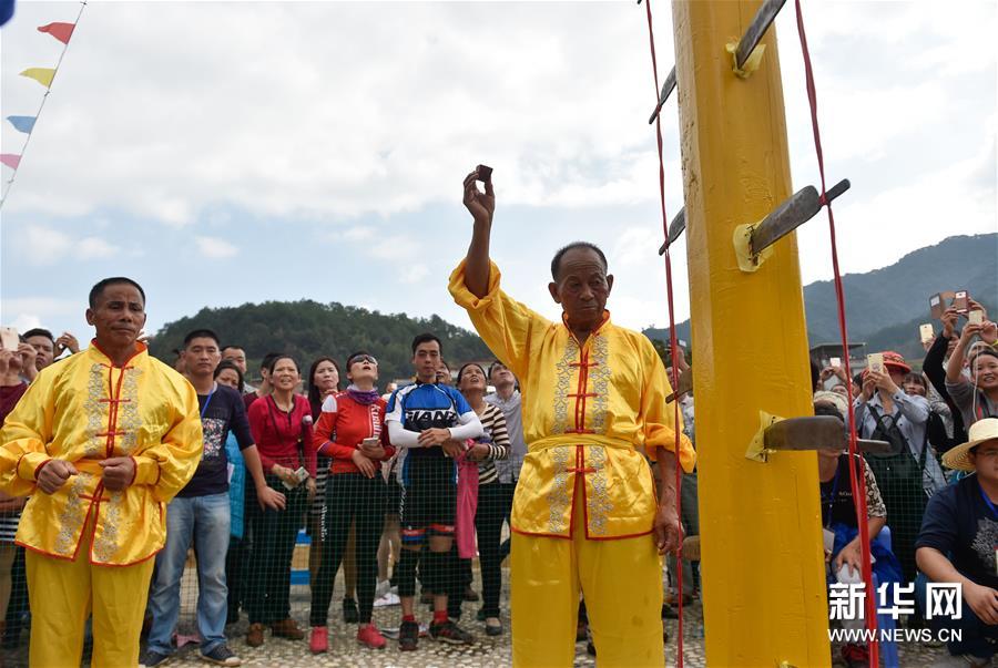 農(nóng)歷十月十五前后,福建西部武平縣各山村陸續(xù)進入農(nóng)閑時節(jié)。按照當(dāng)?shù)仫L(fēng)俗,不同村子各自擇日舉辦民間活動,其中較有代表性的就是“上刀山”絕技?!吧系渡健苯^技在閩西山村流傳已有數(shù)百年歷史,表演者需光腳順著磨得鋒利閃亮的36把鋼刀,攀登至8米高的杉木柱子頂部,接受長者祝福,祈求風(fēng)調(diào)雨順、五谷豐登。新華社記者 宋為偉 攝