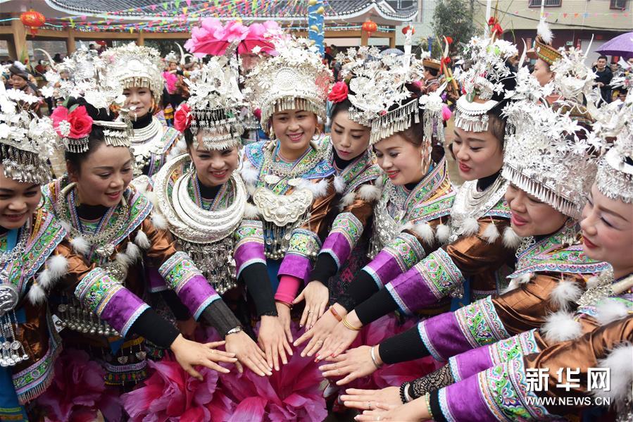 2月7日,廣西融水苗族自治縣安太鄉(xiāng)苗族群眾開展傳統(tǒng)的“打同年”民俗活動。當(dāng)?shù)財?shù)百名苗族同胞與游客們歡聚一堂,一起開展對歌、蘆笙踩堂、文藝晚會等活動,歡慶新春佳節(jié)。 “打同年”是融水苗族村寨的一種民俗,即友好村寨之間的拜年聯(lián)歡活動。新華社記者 李斌 攝