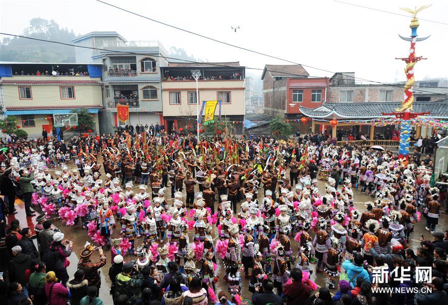 2月7日,廣西融水苗族自治縣安太鄉(xiāng)苗族群眾開展傳統(tǒng)的“打同年”民俗活動。當地數百名苗族同胞與游客們歡聚一堂,一起開展對歌、蘆笙踩堂、文藝晚會等活動,歡慶新春佳節(jié)。 “打同年”是融水苗族村寨的一種民俗,即友好村寨之間的拜年聯歡活動。新華社記者 李斌 攝