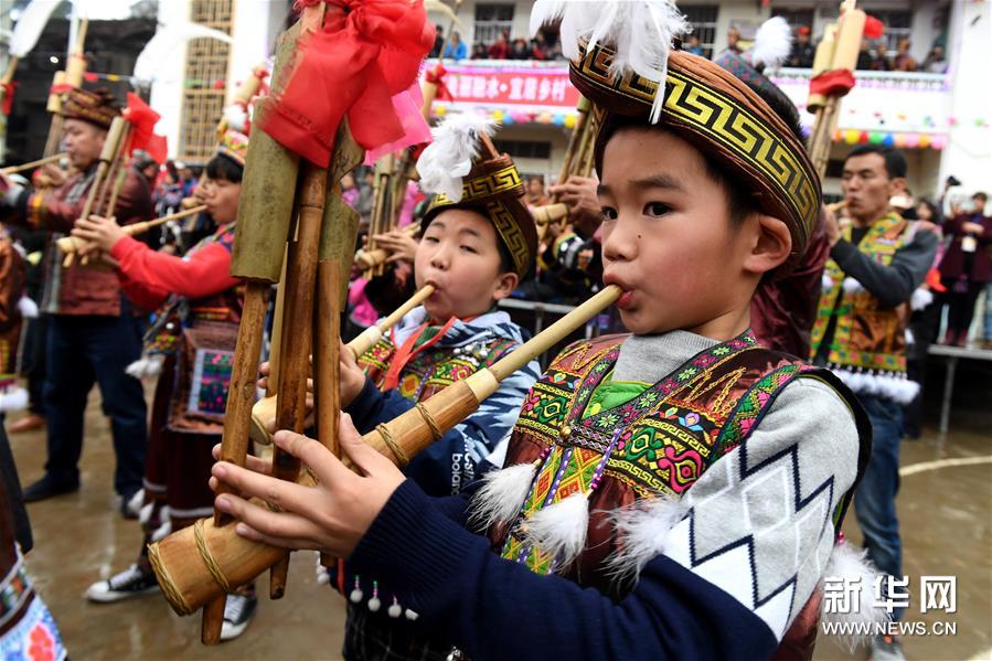2月7日,廣西融水苗族自治縣安太鄉(xiāng)苗族群眾開展傳統(tǒng)的“打同年”民俗活動。當(dāng)?shù)財?shù)百名苗族同胞與游客們歡聚一堂,一起開展對歌、蘆笙踩堂、文藝晚會等活動,歡慶新春佳節(jié)。 “打同年”是融水苗族村寨的一種民俗,即友好村寨之間的拜年聯(lián)歡活動。新華社記者 李斌 攝
