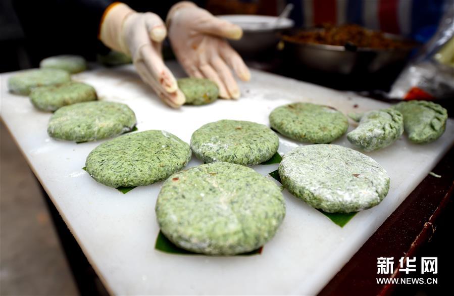 4月2日,黃山市徽州區(qū)西溪南村村民在制作清明粿。清明將至,安徽省黃山市徽州區(qū)的農(nóng)家忙著制作清明粿。清明粿是當?shù)厍迕鲿r節(jié)的特色小吃,將新鮮艾草汁拌入糯米粉,再填入徽州特色風味的火腿肉、筍丁、肉絲蘿卜丁等原料做成的餡,捏合成清明粿,蒸熟即可食用。新華社發(fā)(周牧 攝)