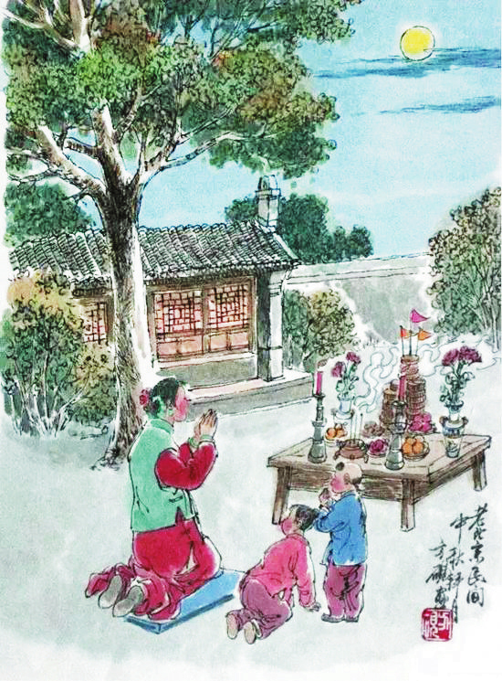 “中秋月。月到中秋偏皎潔。”賞月是中秋節(jié)的重要習(xí)俗,我國民間的中秋賞月活動約始于魏晉時期,盛于唐朝,當(dāng)時許多名篇佳作中都有詠月的詩句。北宋時期,以賞月活動為中心的中秋節(jié)已成為普遍的民俗節(jié)日,然而與唐代不同的是,宋代關(guān)于賞月的作品多是感物傷懷,以陰晴圓缺喻人情世態(tài)。宋代的中秋夜是不眠之夜,夜市通宵營業(yè),游人絡(luò)繹不絕,《東京夢華錄》中載:“中秋節(jié)前,諸店皆賣新酒,貴家結(jié)飾臺榭,民家爭占酒樓玩月,笙歌遠聞千里,嬉戲連坐至?xí)??!币恍┑胤缴踔亮鱾鳌爸星镆乖酵硭介L壽”的說法,于是有了守夜的習(xí)俗。守夜時,家里長輩通常會給小孩講關(guān)于月亮的故事,如嫦娥奔月、吳剛伐桂等,孩子們個個聽得津津有味。