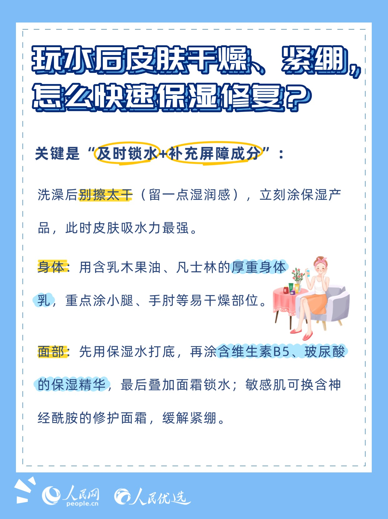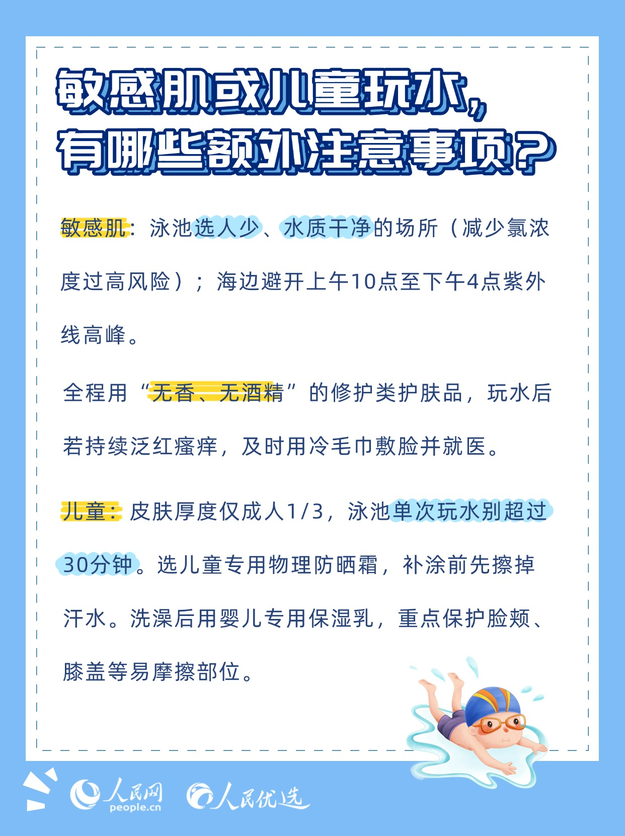 夏日炎炎,無論是泳池里的清涼暢游,還是海邊的逐浪嬉戲,都是驅(qū)散暑氣的不錯選擇。但玩水的快樂背后,卻藏著不少傷害皮膚的“陷阱”——泳池的消毒劑、海邊的強(qiáng)紫外線、海水中的高鹽分,稍有不慎就可能引發(fā)皮膚干燥、泛紅、曬黑、長斑甚至?xí)駛?。本期《人民?yōu)選來了》教你掌握科學(xué)的護(hù)膚方法,讓你在享受玩水樂趣的同時(shí),保持健康的肌膚狀態(tài)。