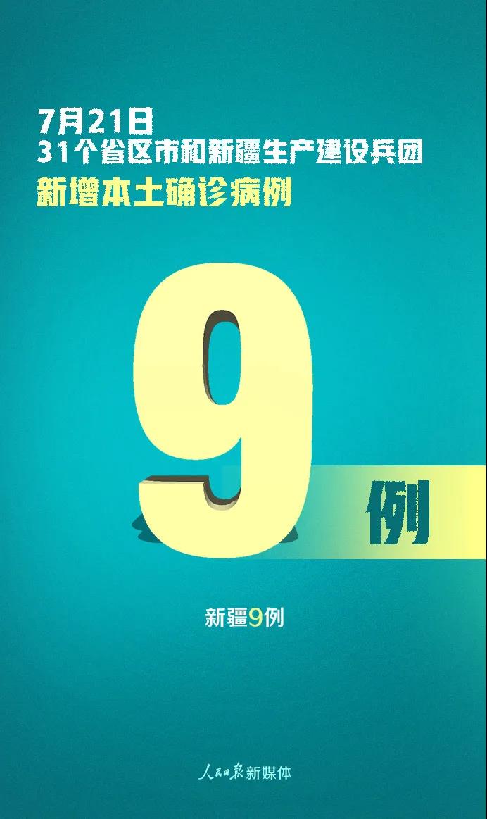 7月21日0—24時,31個?。ㄗ灾螀^(qū)、直轄市)和新疆生產(chǎn)建設兵團報告新增確診病例14例,其中境外輸入病例5例(上海2例,廣東2例,云南1例),本土病例9例(均在新疆);無新增死亡病例;無新增疑似病例。