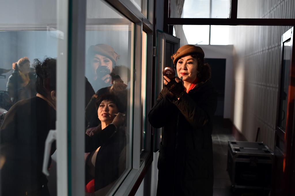 ↑1月3日,在山西省渾源縣貧困山區(qū)合唱團(tuán),一名團(tuán)員在舞臺邊化妝。