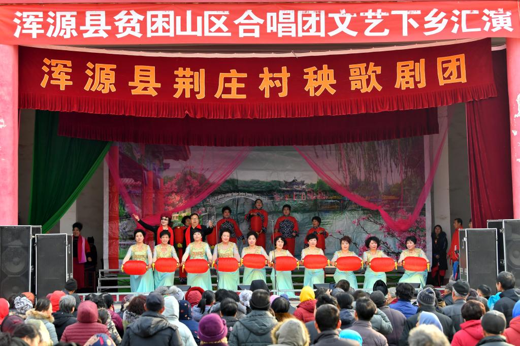 ↑1月3日,在山西省渾源縣荊莊村,渾源縣貧困山區(qū)合唱團(tuán)在表演歌舞《看山看水看中國》。