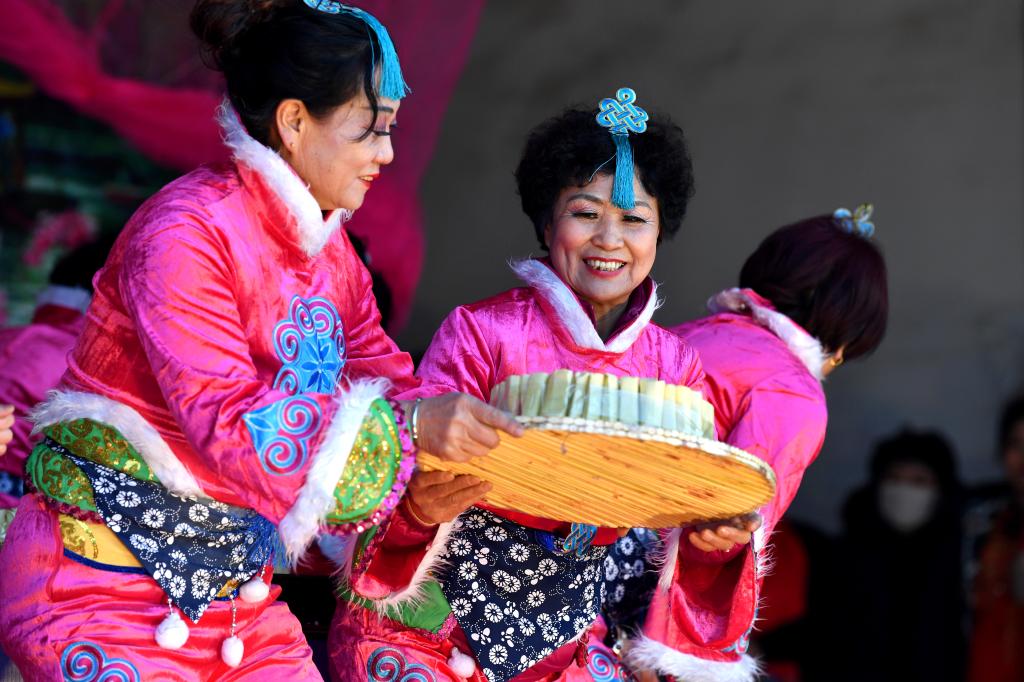 ↑1月3日,在山西省渾源縣荊莊村,渾源縣貧困山區(qū)合唱團(tuán)在表演舞蹈《大豐收》。