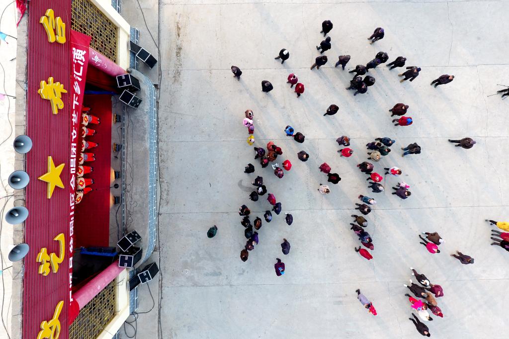 ↑1月3日,在山西省渾源縣荊莊村,村民們在欣賞渾源縣貧困山區(qū)合唱團(tuán)的演出(無人機(jī)拍攝)。