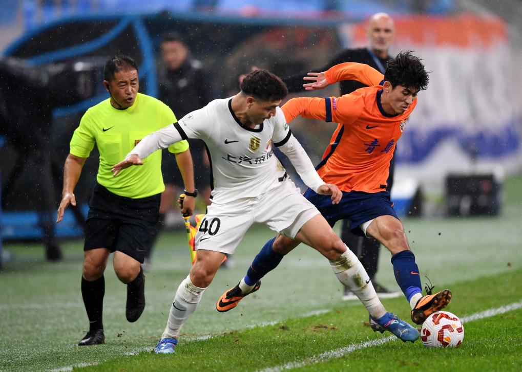10月17日,上海海港隊(duì)球員吾米提江·玉蘇普(前左)在比賽中與青島海牛隊(duì)球員買烏郎·米吉提拼搶。當(dāng)日,在山東青島舉行的2025賽季中超聯(lián)賽第27輪比賽中,上海海港隊(duì)客場(chǎng)4:3戰(zhàn)勝青島海牛隊(duì)。新華社記者 李紫恒 攝