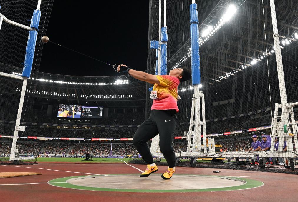 9月15日,2025年世界田徑錦標(biāo)賽女子鏈球決賽在日本東京舉行,圖為中國(guó)選手張家樂(lè)在比賽中試投。新華社記者 宋彥樺 攝