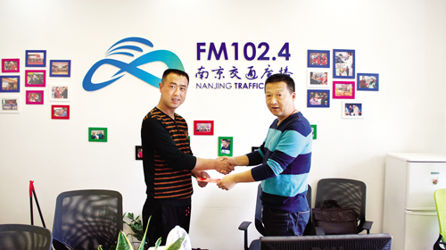 4月7日,在南京交通廣播“智勇在線”節(jié)目組,來(lái)自忻州市定襄縣的智杰(左)和主持人智勇在一起,并受到了該媒體的贊譽(yù)與獎(jiǎng)勵(lì)(劉捷 攝) 說(shuō)起智杰這個(gè)名字,人們可能有點(diǎn)兒淡忘,但說(shuō)起“在南京救了一公交車人”的定襄青年,人們卻印象深刻。從開(kāi)始微信朋友圈相傳的“定襄小伙智杰在南京救了70多名乘客”,到本報(bào)記者和智杰遠(yuǎn)赴南京實(shí)地求證,并在本報(bào)4月12日三版推出深度報(bào)道《千鈞一剎真英雄》,智杰這個(gè)樸實(shí)的定襄小伙一步步走進(jìn)了人們心里。他的事跡在市民中廣為流傳,甚至一些商家如山西海爾熱水器總代理段明剛在聽(tīng)說(shuō)他的事情后,深為感動(dòng),主動(dòng)相送產(chǎn)品表示敬意。