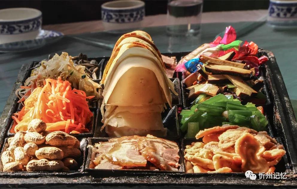 水菜盒子,是一個(gè)木制的長(zhǎng)方形盒子,長(zhǎng)約40多厘米,寬約20多厘米,高約10多厘米。木盒分蓋子和底座,底色多漆為紅黑兩色。蓋子上有的還畫有人物、山水、花卉等圖案,為描金漆處理。底座內(nèi)有12個(gè)木制的小長(zhǎng)方形碟子,以3行4列的形式排列,用來(lái)裝涼拌菜。傳統(tǒng)的涼拌菜為四葷、二素、六干果,但后來(lái)大多演變?yōu)樗娜?、四素、四干果。其中的“四葷”為雞蛋餅、冷片肉、蒸肉、鹵肉;“四素”幾乎全是清淡的蔬菜,如綠豆芽、胡蘿卜、土豆絲、菠菜、胡芹等;“六干果”分別是葵花子、水果糖、南瓜子、油蛋蛋、金銀棗、蝦片。在忻府區(qū),過(guò)去家家戶戶但凡婚喪嫁娶,總要上水菜盒子,這就是老忻州人好說(shuō)的“八八六六”。其中“八八”即水菜盒子(除去里面的干果正好8小碟菜),代表涼菜。