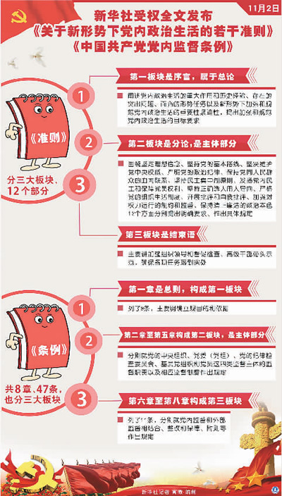 黨的十八屆六中全會(huì)審議通過的《關(guān)于新形勢下黨內(nèi)政治生活的若干準(zhǔn)則》和《中國共產(chǎn)黨黨內(nèi)監(jiān)督條例》,是新形勢下加強(qiáng)和規(guī)范黨內(nèi)政治生活、加強(qiáng)黨內(nèi)監(jiān)督的綱領(lǐng)性文獻(xiàn),是堅(jiān)持思想建黨和制度治黨相結(jié)合、推進(jìn)全面從嚴(yán)治黨形成的新制度安排,是對馬克思主義建黨理論和實(shí)踐的創(chuàng)新發(fā)展。