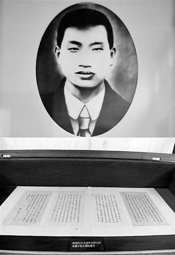 圖為拼版照片。上圖為陳覺像;下圖為湖南省長沙市烈士公園展出的陳覺烈士寫給妻子趙云霄的遺書(5月7日攝)。新華社發(fā) 有這樣一對(duì)革命伉儷,他們的事跡因?yàn)閮煞庋獪I遺書為世人傳頌,這兩封遺書感動(dòng)了一代又一代人。一封是就義前丈夫?qū)懡o妻子的訣別信,一封是妻子寫給剛出生女兒的遺書。這兩封遺書的作者是陳覺和趙云霄。 陳覺,原名陳炳祥,生于湖南醴陵。15歲那年,陳覺以優(yōu)異的成績考入醴陵縣立中學(xué)。在進(jìn)步教師的影響下,經(jīng)常閱讀《向?qū)А贰缎虑嗄辍返雀锩铩?925年,陳覺加入中國共產(chǎn)黨。趙云霄,原名趙鳳培,河北阜平人,1906年生,1925年加入中國共產(chǎn)黨。 1925年,趙云霄、陳覺作為第一批先進(jìn)的中國青年前往莫斯科中山大學(xué)學(xué)習(xí)。學(xué)習(xí)期間,二人相識(shí)相知相愛,結(jié)為夫妻。 1927年,趙云霄、陳覺一起回國參加革命。1928年春,作為省委特派員,陳覺參與指揮中共湘東特委和醴陵縣委組織的“醴陵年關(guān)暴動(dòng)”。 由于當(dāng)?shù)馗骷?jí)黨組織遭到嚴(yán)重破壞,陳覺夫婦被迫離開醴陵,回到省委機(jī)關(guān)工作。之后,陳覺被派往常德組織湘西特委。已有身孕的趙云霄,留在省委機(jī)關(guān)負(fù)責(zé)各地聯(lián)絡(luò)工作。 1928年4月,由于叛徒告密,陳覺、趙云霄在常德、長沙分別被敵人逮捕,關(guān)押在長沙陸軍監(jiān)獄。 面對(duì)反動(dòng)當(dāng)局的威逼利誘、嚴(yán)刑拷打,陳覺夫婦寧死不屈。多次審訊未果,反動(dòng)當(dāng)局以“策劃暴動(dòng),圖謀不軌”的罪名,判處陳覺、趙云霄死刑。 就義前,在給愛妻的訣別信中,陳覺寫道:“云!誰無父母,誰無兒女,誰無情人,我們正是為了救助全中國人民的父母和妻兒,所以犧牲了自己的一切。我們雖然是死了,但我們的遺志自有未死的同志來完成。”1928年10月14日,陳覺在長沙犧牲。 4個(gè)月后,趙云霄在獄中誕下一名女嬰,取名啟明,意為在黑暗中盼望破曉。生下啟明僅僅1個(gè)多月,趙云霄就要和女兒永別了,她在給女兒的遺書中寫道:“小寶寶,我很明白地告訴你,你的父母是共產(chǎn)黨員……我不能撫育你長大,希望你長大時(shí)好好讀書,且要知道你的父母是怎樣死的……望你好好長大成人,且好好讀書,才不辜負(fù)你父母的期望?!?929年3月26日,在給襁褓中的女兒喂過最后一口奶后,趙云霄毅然走上刑場,犧牲時(shí)年僅23歲。 如今,在陳覺的家鄉(xiāng),醴陵市烈士陵園中豎立著這對(duì)革命伉儷的雕像,夫妻二人緊緊相依,矚目前方。醴陵市烈士陵園管理所副所長楊云志告訴記者,“雖然身處和平年代,但我們依然被他們的精神打動(dòng)?!?(據(jù)新華社) (責(zé)任編輯:籍俊霞) |