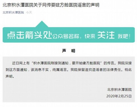 人民網(wǎng)北京2月25日電 據(jù)北京積水潭醫(yī)院官方微信公眾號(hào)消息,針對(duì)近日網(wǎng)上有“北京積水潭醫(yī)院剛接到通知,要開(kāi)始建方艙醫(yī)院”的傳言,院方回應(yīng),沒(méi)接到這方面通知,該消息不實(shí),純屬謠言。