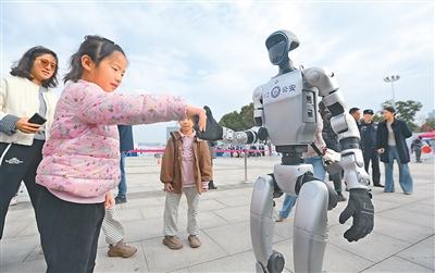 10月25日,江蘇省揚州市公安局在揚州市明月湖廣場舉行警營開放日活動,現(xiàn)場設(shè)立多個主題互動展區(qū),市民可以近距離接觸警務(wù)裝備。圖為人形機器人與小朋友互動。孟德龍攝(人民視覺)
