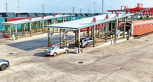 廣州國(guó)際物流港基地,工作人員駕駛待運(yùn)車輛進(jìn)入車廂。張國(guó)卿攝